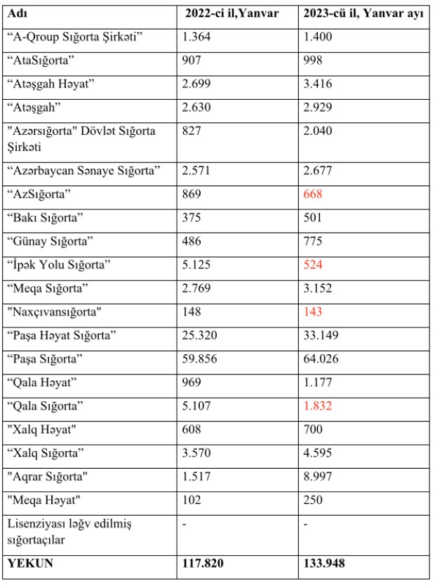 2022-ci ilin yanvar ayı ilə müqayisədə 2023-cü ilin yanvar ayında 20 sığorta şirkətindən 4-ünün hesabladığı sığorta haqları azalıb.