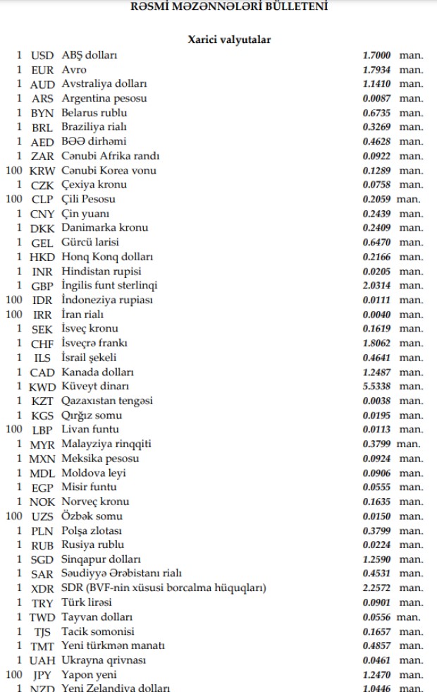 27.02.2023 -cü il tarixindən etibarən xarici valyutaların Azərbaycan manatına qarşı RƏSMİ MƏZƏNNƏLƏRİ