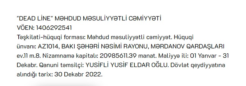 Dövlət Vergi Xidməti "Dead Line" MMC-nin dövlət qeydiyyatına alıb.
