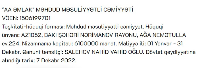 Marja xəbər verir ki, Dövlət Vergi Xidməti "AA ƏMLAK" MMC-ni dövlət qeydiyyatına alıb.