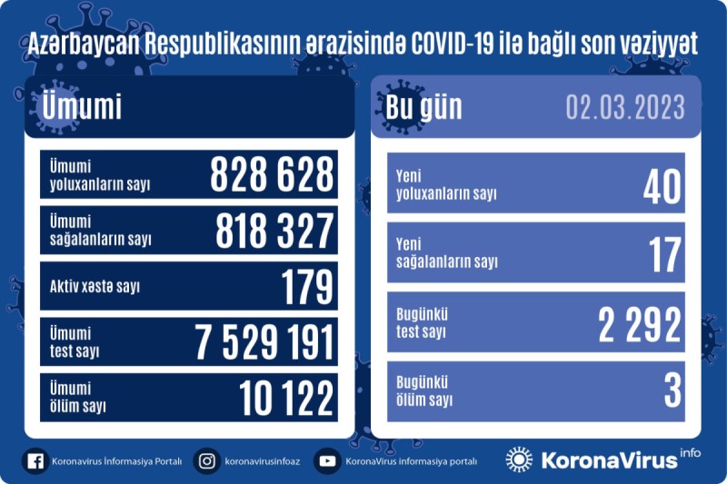 Azərbaycan Respublikasında koronavirus (COVID-19) infeksiyasına 40 yeni yoluxma faktı qeydə alınıb, 17 nəfər müalicə olunaraq sağalıb.