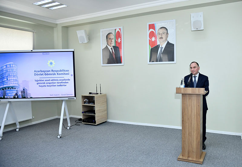 Dövlət Gömrük Komitəsi sədrinin müavini Cavad Qasımov işğaldan azad olunmuş ərazilərdə gömrük postlarının fəaliyyətinin təşkili istiqamətində görülən işlər barədə məlumat verib, bu ərazilər üzrə idxalı gömrük rüsumlarından azad edilən iqtisadi fəaliyyət sahələri və mal nomenklaturaları üzrə texnikanın, texnoloji avadanlıqların və qurğuların, habelə xammal və materialların siyahısının hazırlandığını diqqətə çatdırıb.