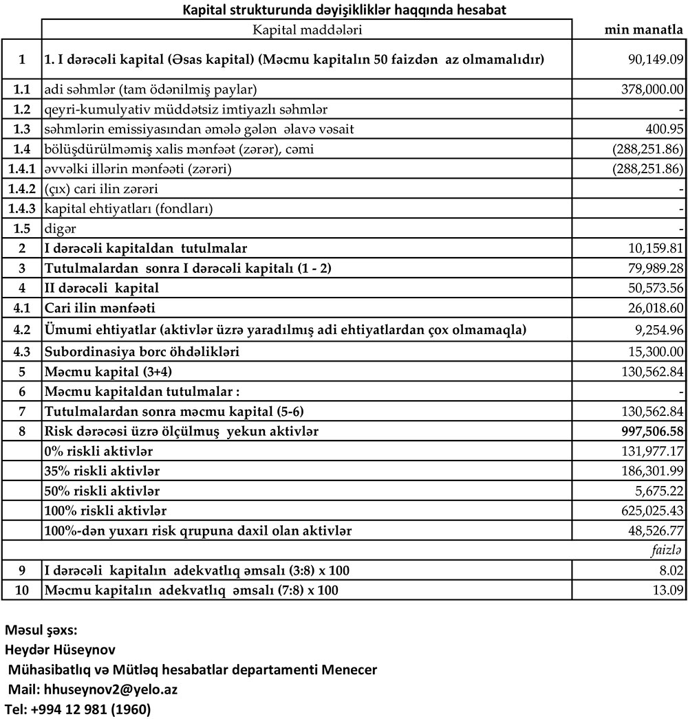 30 İyun 2024-cü il tarixində "Yelo Bank” 130 milyon 563 min manat məcmu kapitala malik olub. Bank ötən ilin sonunda 109 milyon 761 min manat məcmu kapitala malik idi.
