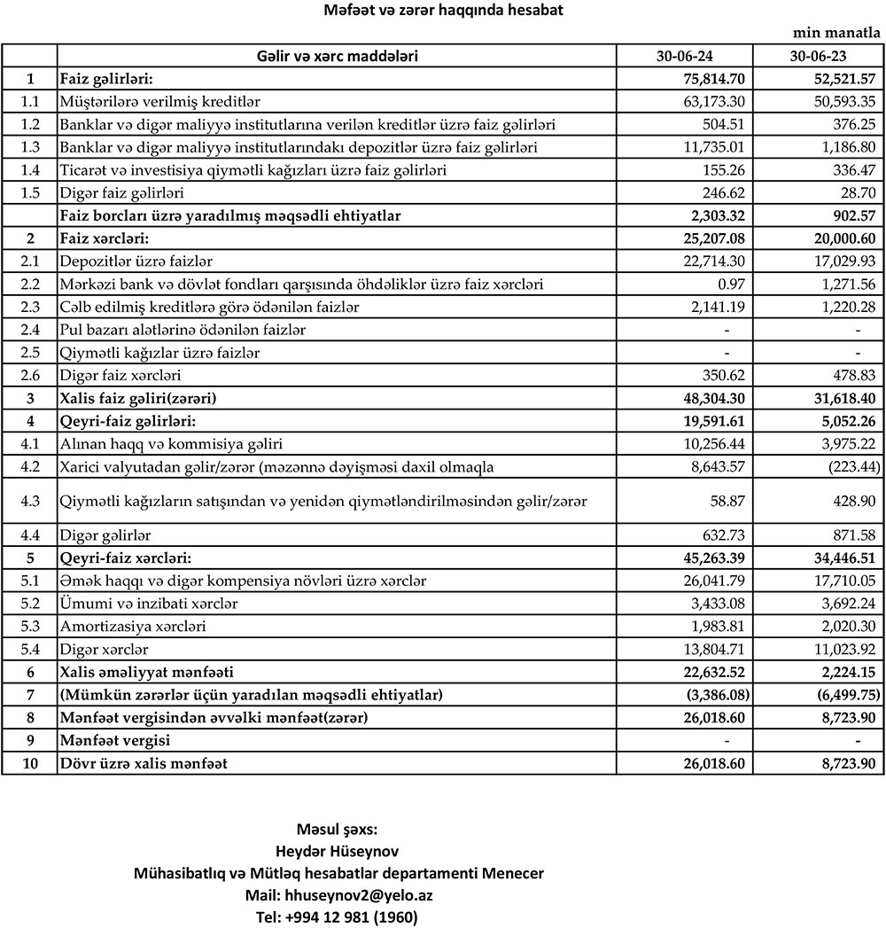 "Yelo Bank" ASC 2024-cü ilin ilk 6 ayını (yanvar-iyun) 26 milyon 19 min manat xalis mənfəət ilə başa vurub. Bank 2023-cü ilin eyni dövrünü 8 milyon 724 min manat xalis mənfəət ilə bağlamışdı. Beləliklə, "Yelo Bank"ın xalis mənfəəti 2024-cü ilin ilk yarısında ötən ilin eyni dövrü ilə müqayisədə 17 milyon 295 min manat və ya təximən 3 dəfə artıb.