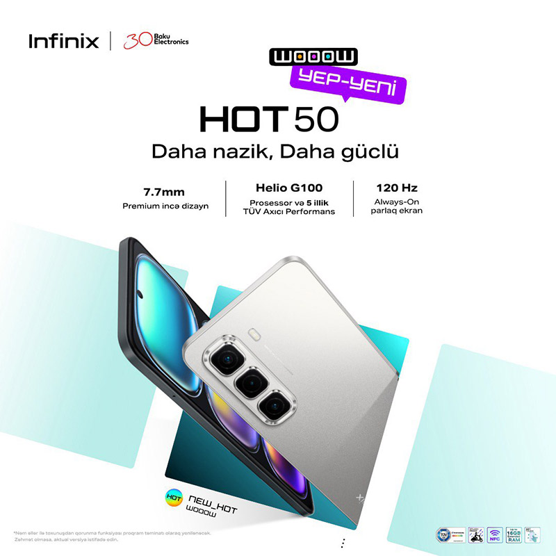 Infinix Hot 50 smartfonları artıq Baku Electronics və ölkənin digər böyük ixtisaslaşdırılmış mağaza şəbəkələrində satışdadır, qiymət daxili yaddaş həcminə görə fərqlidir: 128GB – 399 manata, 256GB – 459 manatadır.
