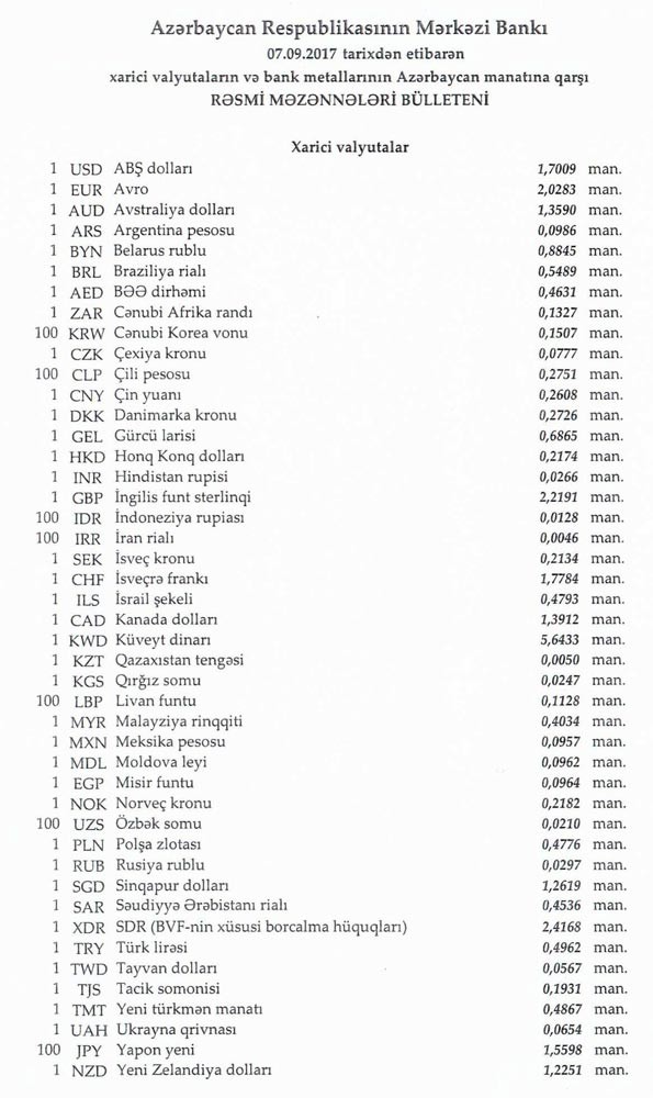 Sentyabrın 6-da rəsmi olaraq 1 dollar 1,7009 manata, 1 avro isə 2.0265 manata bərabər idi.
