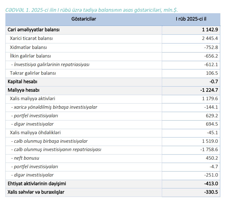 Bu barədə Marja.az Azərbaycan Mərkəzi Bankının açıqladığı "2025-ci ilin I rübü üzrə Azərbaycan Respublikasının tədiyə balansı"na istinadən xəbər verir.