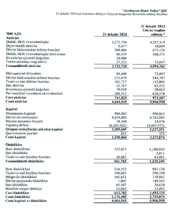 "Azərbaycan Dəmir Yolları"nın özündən böyük defisiti var"Azərbaycan Dəmir Yolları" QSC (ADY) 2024-cü ili 1 milyard 819 milyon 495 min manat xalis zərər ilə başa vurub. QSC 2023-cü ili 100 milyon 963 min manat xalis zərər ilə bağlamışdı. Beləliklə, ötən il 2023-cü illə müqayisədə "Azərbaycan Dəmir Yolları"nın xalis zərəri 18 dəfə və ya 1 milyard 718 milyon 532 min manat artıb.