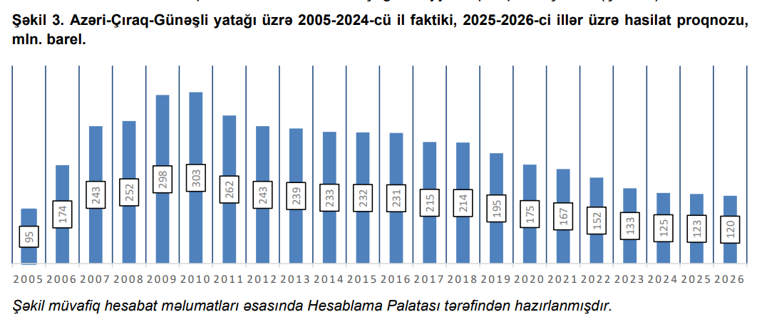 Qeyd edilib ki, Azəri–Çıraq–Günəşli yatağı üzrə hasilatın pik səviyyəsi 2010-cu ildə 303,0 mln. barel təşkil etmiş və həmin ildən etibarən hasilatda ardıcıl azalma müşahidə olunmuşdur. Təqdim olunan məlumatlara əsasən, 2026-cı ildə yataq üzrə hasilatın həcmi pik dövr (2010-cu il) ilə müqayisədə 183,0 mln. barel az olmaqla, təxminən 2,5 dəfə aşağı səviyyədə proqnozlaşdırılır