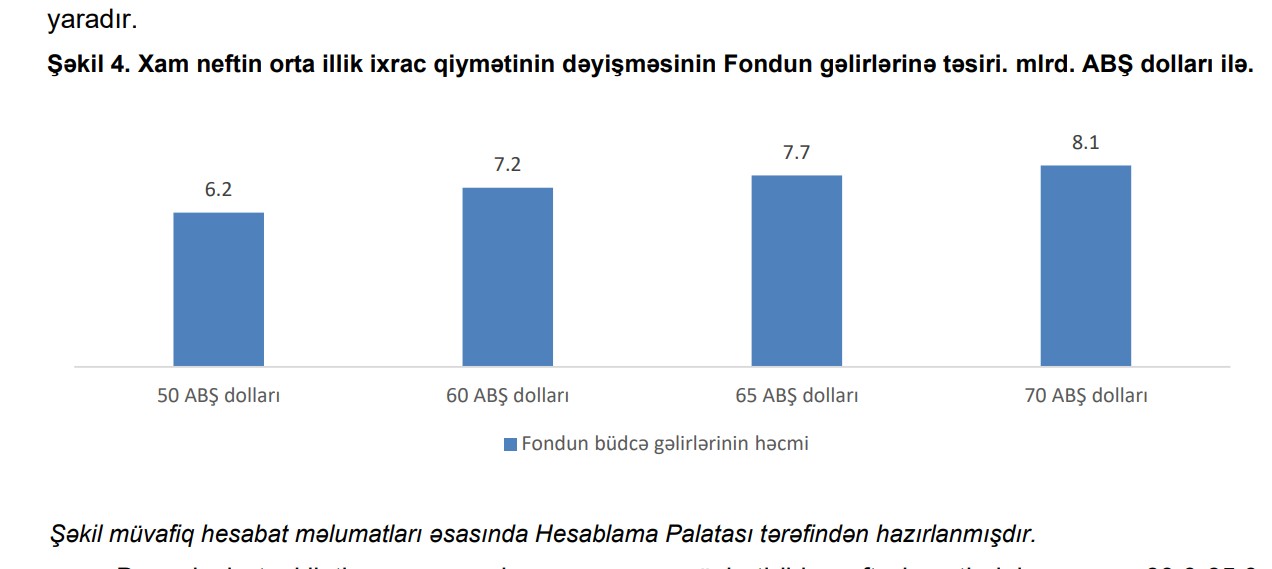 Eyni zamanda, Fond tərəfindən təqdim edilmiş məlumatlara əsasən 1 barel neftin orta illik ixrac qiymətində hər 5,0 ABŞ dolları dəyişiklik Fondun gəlirlərində təxminən 0,5 mlrd. ABŞ dolları dəyişiklik yaradır.