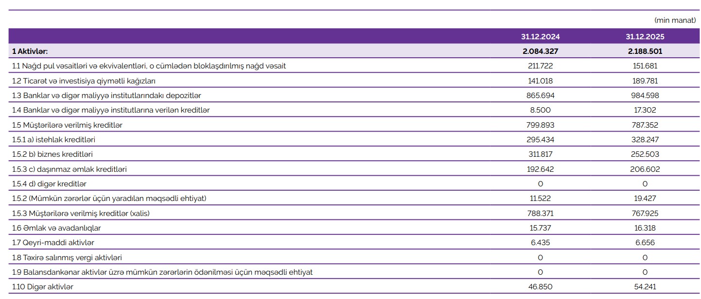 2025-ci ilin sonuna banklar və digər maliyyə institutlarındakı depozitlər 984 milyon 598 min manat olub. Bu göstərici 2024-cü ilin sonu ilə müqayisədə 118 milyon 904 min manat və ya 13,7 faiz artıb və Bankın likvidlik mövqeyini gücləndirib.