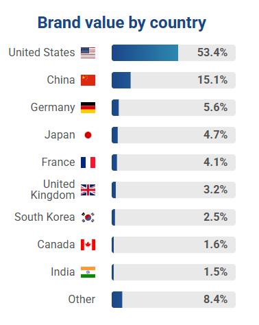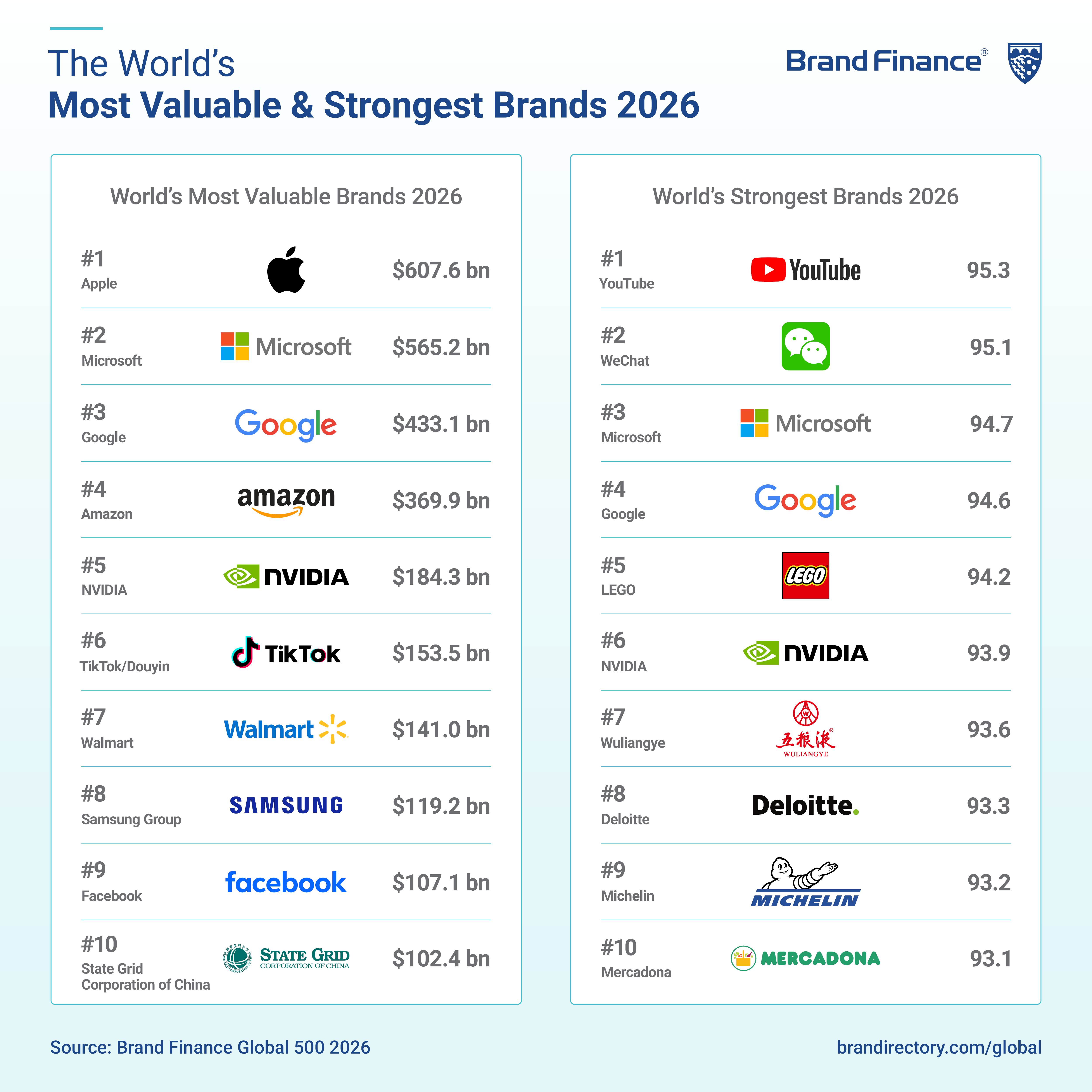 2026-cı ildə Global 500 siyahısında ilk 10 marka ümumi marka dəyərinin 27%-ni təşkil edir ki, bu da ABŞ-ın aparıcı texnologiya nəhənglərinin qlobal iqtisadiyyatda üstünlüyünün davam etdiyini göstərir. İlk onluqdakı markalardan altısı ABŞ texnologiya şirkətləridir. Apple-dan sonra Microsoft 2026-cı ildə 23% artımla 565,2 milyard dollardan çox marka dəyəri ilə dünyanın ikinci ən dəyərli markasıdır. Google (5% artımla 433,1 milyard dollar) və Amazon (4% artımla 369,9 milyard dollar) isə müvafiq olaraq üçüncü və dördüncü yerləri qoruyub. NVIDIA 184,3 milyard ABŞ dolları marka dəyəri ilə dünyanın beşinci ən dəyərli markasıdır.
