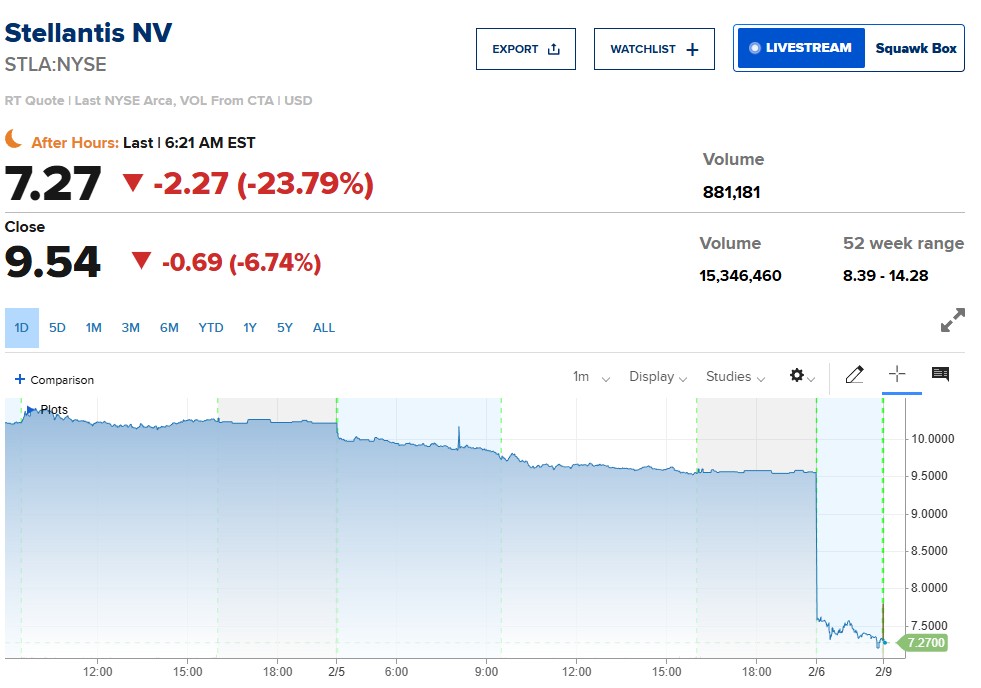 Stellantis şirkətinin səhmləri yüksək məbləğdə zərər açıqlamasından sonra kəskin ucuzlaşıb