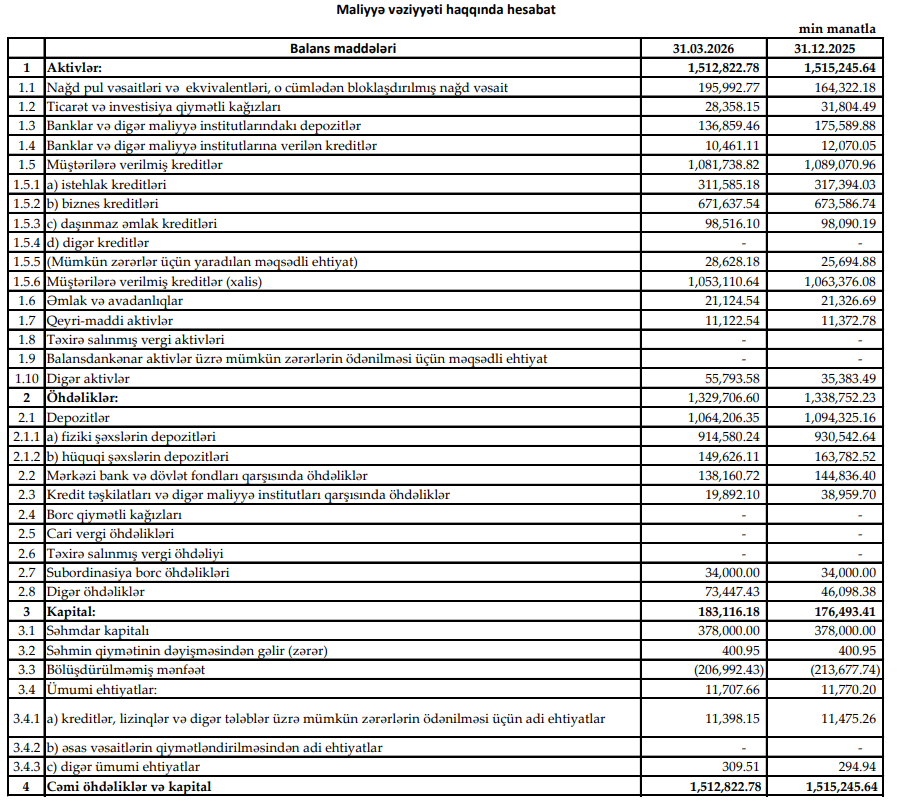 2026-cı ilin 1-ci rübündə "Yelo Bank"ın cəmi aktivləri cüzi azalaraq 31 mart 2026-cı il tarixində 1 milyard 512 milyon 823 min manat, (2025-ci ilin sonunda 1 milyon 515 milyon 246 min manat), o cümlədən kredit portfeli (müştərilərə verilən kreditlər) 0,7% azalaraq 1 milyard 81 milyon 739 min manat təşkil edib (2025-ci ilin sonunda 1 milyard 89 milyon 71 min manat). Bankın istehlak və biznes kreditləri portfelləri azalıb, daşınmaz əmlak kreditləri portfeli isə cüzi artıb