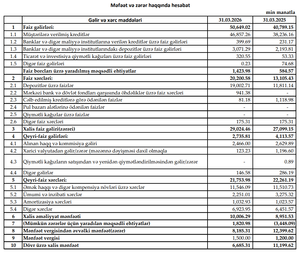 Marja.az-ın məlumatına görə, 2025-ci ilin ilk rübündə "Yelo Bank"ın cəmi əməliyyat gəlirləri 51 milyon 961 min manat, cəmi əməliyyat xərcləri 41 milyon 955 min manat, əməliyyat mənfəəti 10 milyon 6 min manat təşkil edib. Bank əməliyyat mənfəətindən 1 milyon 821 min manat mümkün zərərlər üçün yaradılan məqsədli ehtiyatlara ayırıb, 1 milyon 500 min manat mənfəət vergisi ödəyib. Müqayisə üçün qeyd edək ki, 2025-ci ilin ilk rübündə "Yelo Bank"ın əməliyyat mənfəəti 8 milyon 951 min manat təşkil etmiş, ehtiyatdan qayıdan 3 milyon 448 min manat hesabına mənfəət 12 milyon 400 min manata yüksəlmişdi və 1 milyon 200 min manat mənfəət vergisi ödənilmişdi.