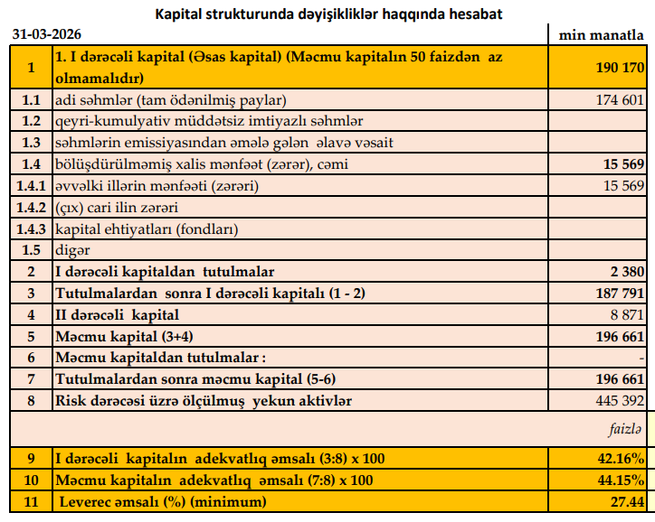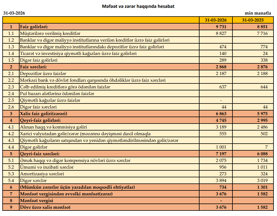 Müqayisə üçün qeyd edək ki, 2025-ci ilin ilk rübündə "Premium Bank"ın cəmi əməliyyat gəlirləri 11 milyon 846 min manat, cəmi əməliyyat xərcləri 8 milyon 964 min manat təşkil etmişdi. Bank 2 milyon 882 min manat əməliyyat mənfəətindən 1 milyon 301 min manat mümkün zərərlər üçün yaradılan məqsədli ehtiyatlara ayırmışdı.