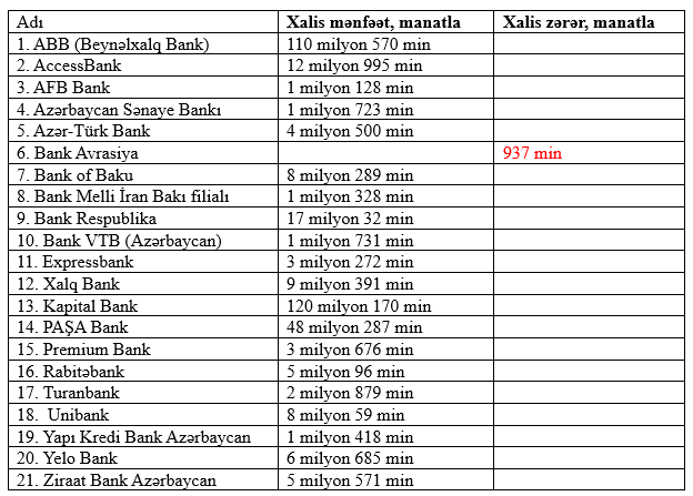 20 bank xalis mənfəət, 1 bank xalis zərər açıqladı - SİYAHI