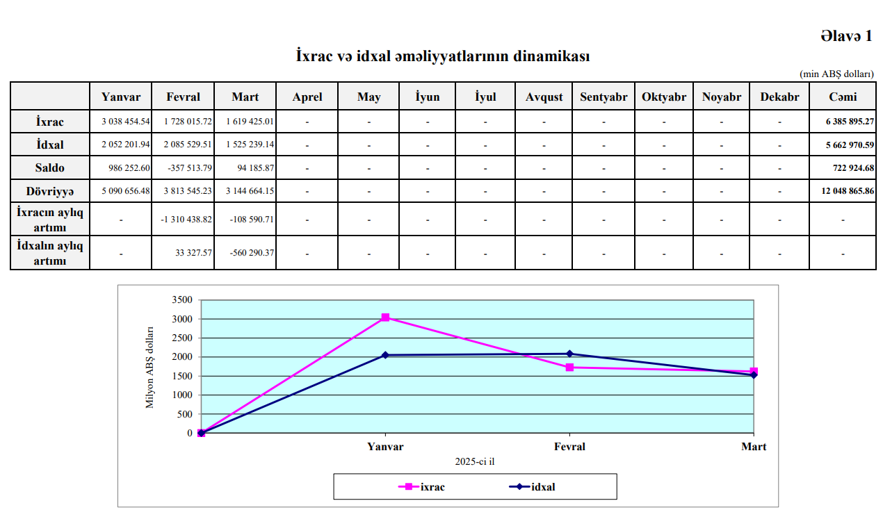 Xatırladaq ki, 2025-ci ilin ilk rübündə Azərbaycanın xarici ticarət əməliyyatlarının həcmi 12 milyard 48 milyon 867 min ABŞ dolları, o cümlədən ixrac 6 milyard 385 milyon 895 min ABŞ dolları,idxal 5 milyard 662 milyon 971 min ABŞ dolları, saldo müsbət 722 milyon 924 min ABŞ dolları təşkil etmişdi.