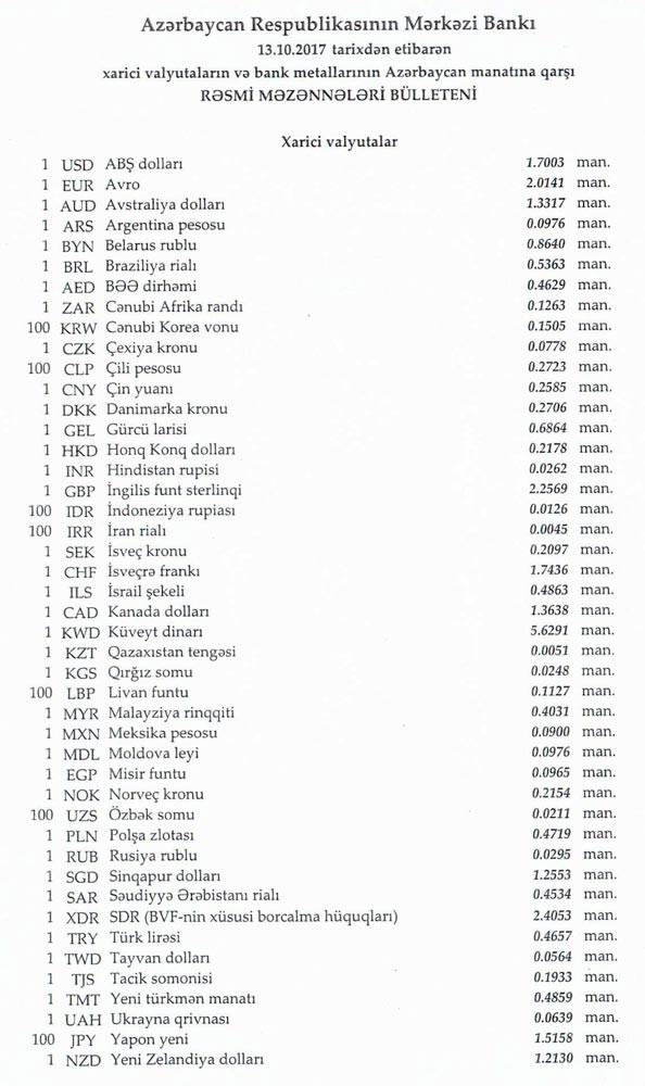 Oktyabrın 13-nə Mərkəzi Bankın açıqladığı rəsmi Dollar/manat məzənnəsi Oktyabrın 12-si ilə müqayisədə dəyişməyərək 1,7003 manat olub, Avro/manat məzənnəsi 2.0141 manata düşüb, Rubl/manat məzənəsi isə 0,0295 manata qalxıb.