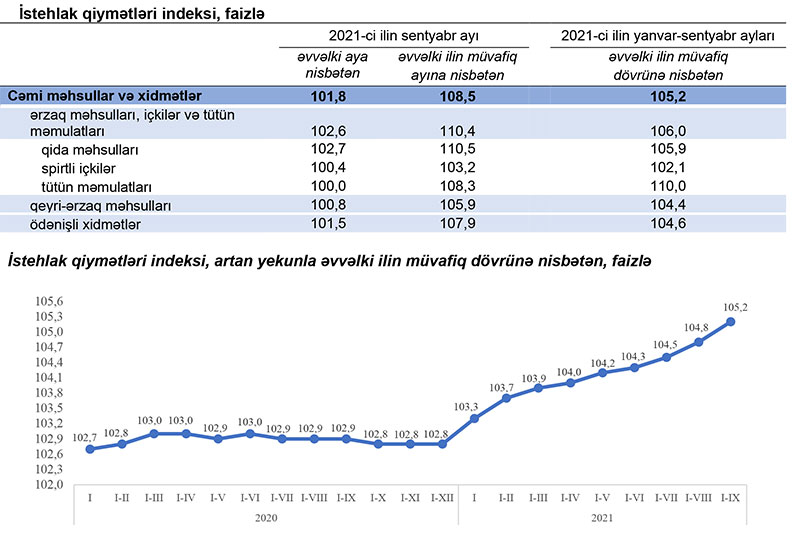 Ərzaq məhsulları 10,5 faiz bahalaşıb.2021-ci ilin yanvar-sentyabr aylarında istehlak qiymətləri indeksi 2020-ci ilin yanvarsentyabr aylarına nisbətən 5,2 faiz, o cümlədən ərzaq məhsulları, içkilər və tütün məmulatları üzrə 6,0 faiz, qeyri-ərzaq məhsulları üzrə 4,4 faiz, əhaliyə göstərilmiş ödənişli xidmətlər üzrə 4,6 faiz artıb. Cari ilin sentyabr ayında istehlak qiymətləri indeksi əvvəlki aya nisbətən 1,8 faiz, əvvəlki ilin sentyabr ayına nisbətən 8,5 faiz artıb.