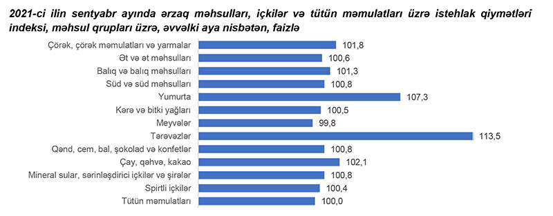 2021-ci ilin sentyabr ayında ərzaq məhsulları, içkilər və tütün məmulatları üzrə istehlak qiymətləri indeksi əvvəlki aya nisbətən 2,6 faiz, əvvəlki ilin sentyabr ayına nisbətən 10,4 faiz artıb.