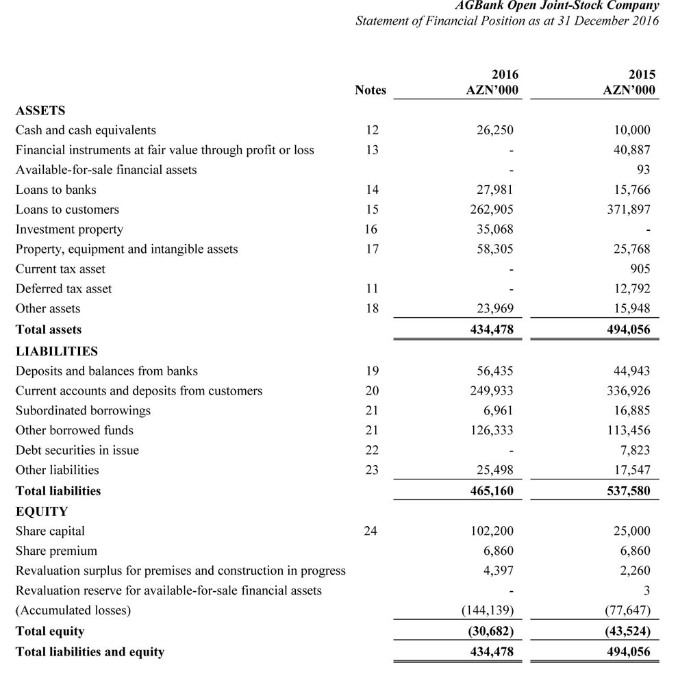 Qeyd etdiyimiz kimi, 2016-cı ildə zərər ilə bağlı olaraq AGBank-ın cəmi balans kapitalı neqativ 43 milyon 524 min manata düşmüşdü, səhm kapitalı isə 25 milyon manat idi. 2016-cı ilin əvvəlində səhmdarları bankın səhm kapitalını 77,2 milyon manat artıraraq 102 milyon manata qaldırdılar. Lakin 2016-cı ildəki zərər daxil yığılmış cəmi 144 milyon 139 min manatlıq zərərə görə, Bankın cəmi kapitalı neqativdən xilas ola bilmədi.